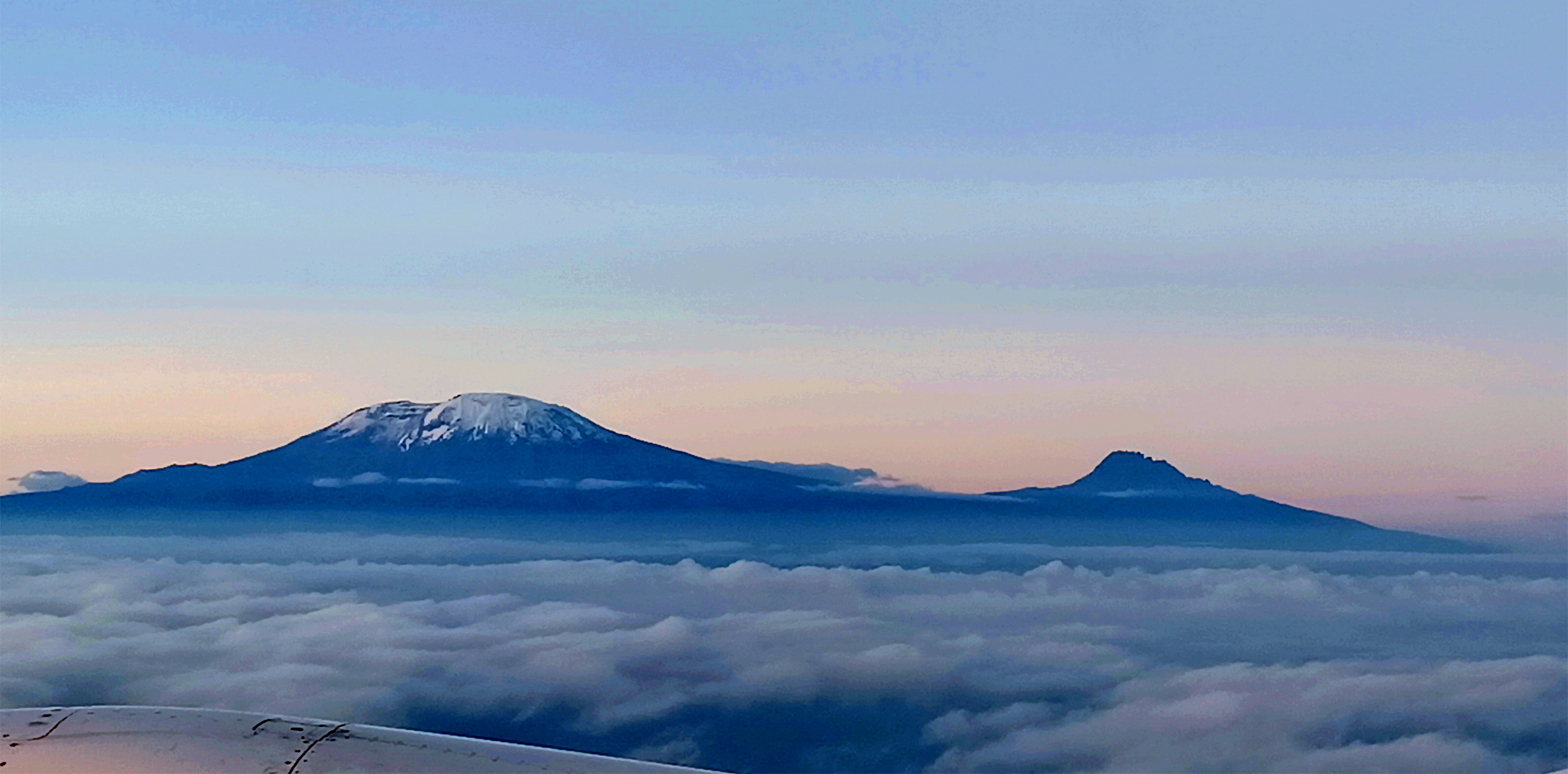 Une dernière belle surprise nous attend dans l'avion où les monts Meru et Kilimandjaro se parent d'or dans le soleil couchant...